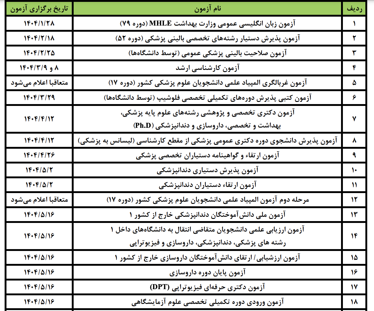 با انتشار تقویم زمانبندی برگزاری آزمونهای مرکز سنجش آموزش پزشکی برای سال ۱۴۰۴ زمان برگزاری آزمون دکتری تخصصی وزارت بهداشت از آبان ماه به تیرماه انتقال یافت .
